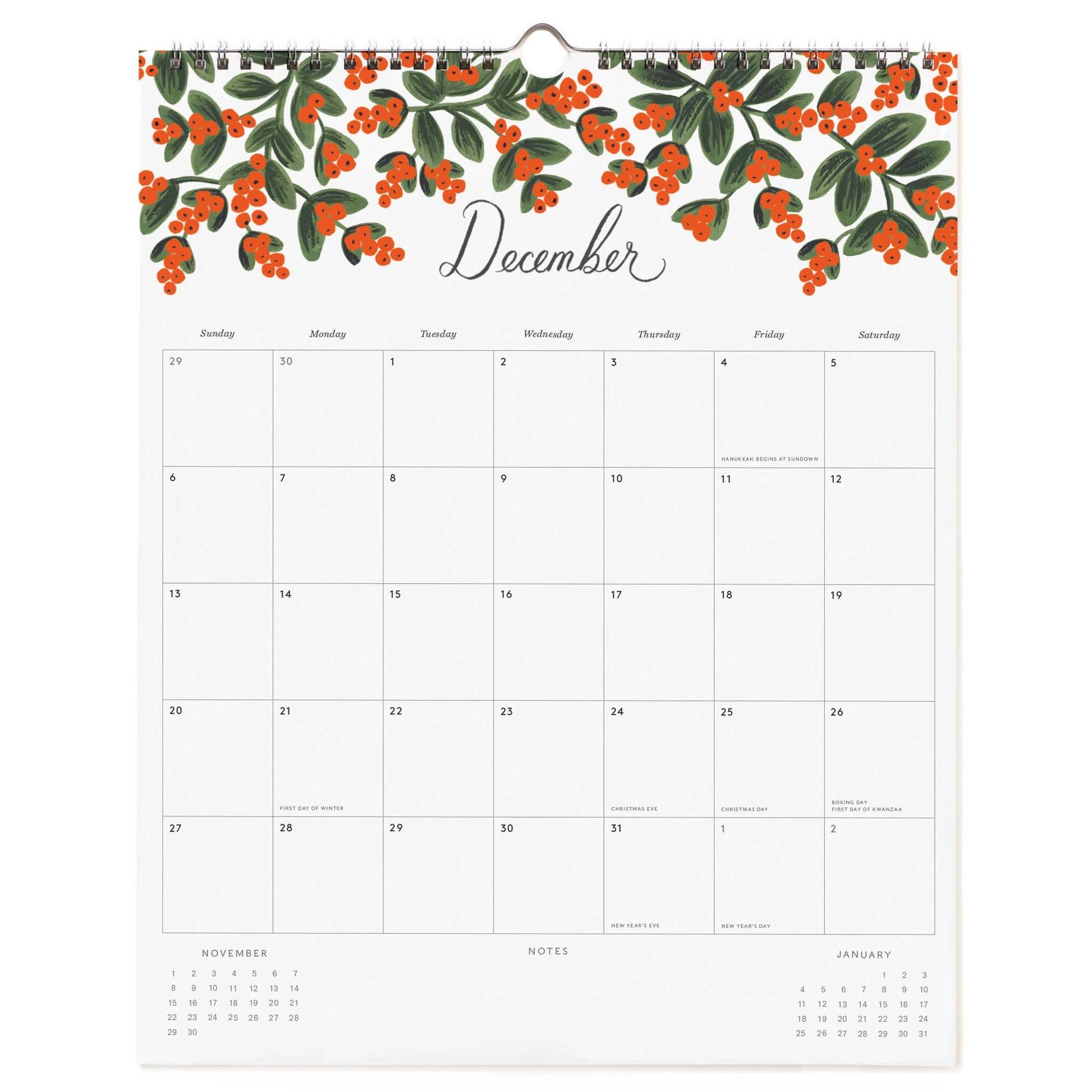 11.9" x 14.75" / January 2026 to December 2026 / Month on a page layout / Features 12 illustrated top borders / Warm white text paper / 14 pages total / Double spiral binding with hanger / Previous and next month calendars / US holidays / Double spiral binding with hanger / Printed in full colour / Cardboard backing / Made in USA