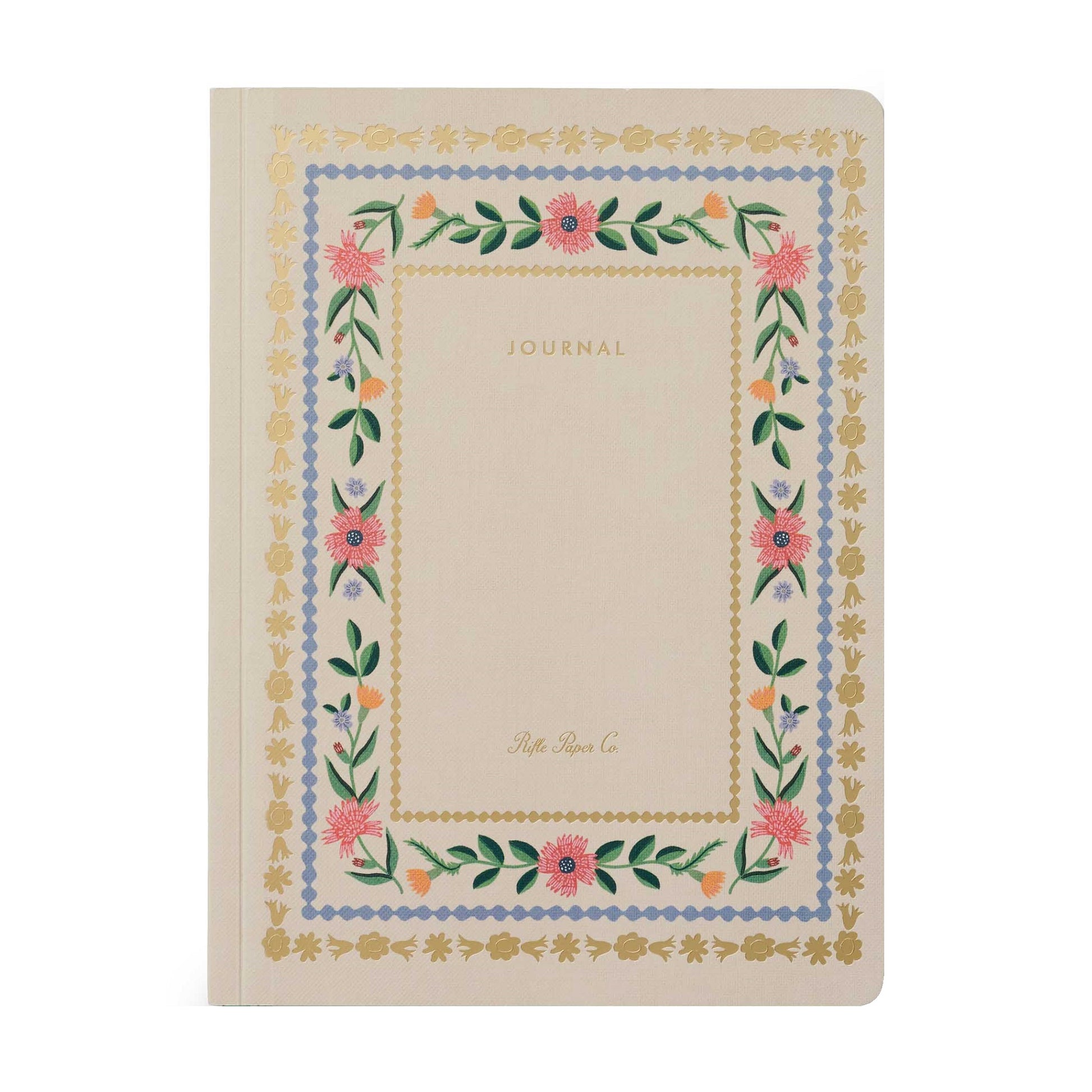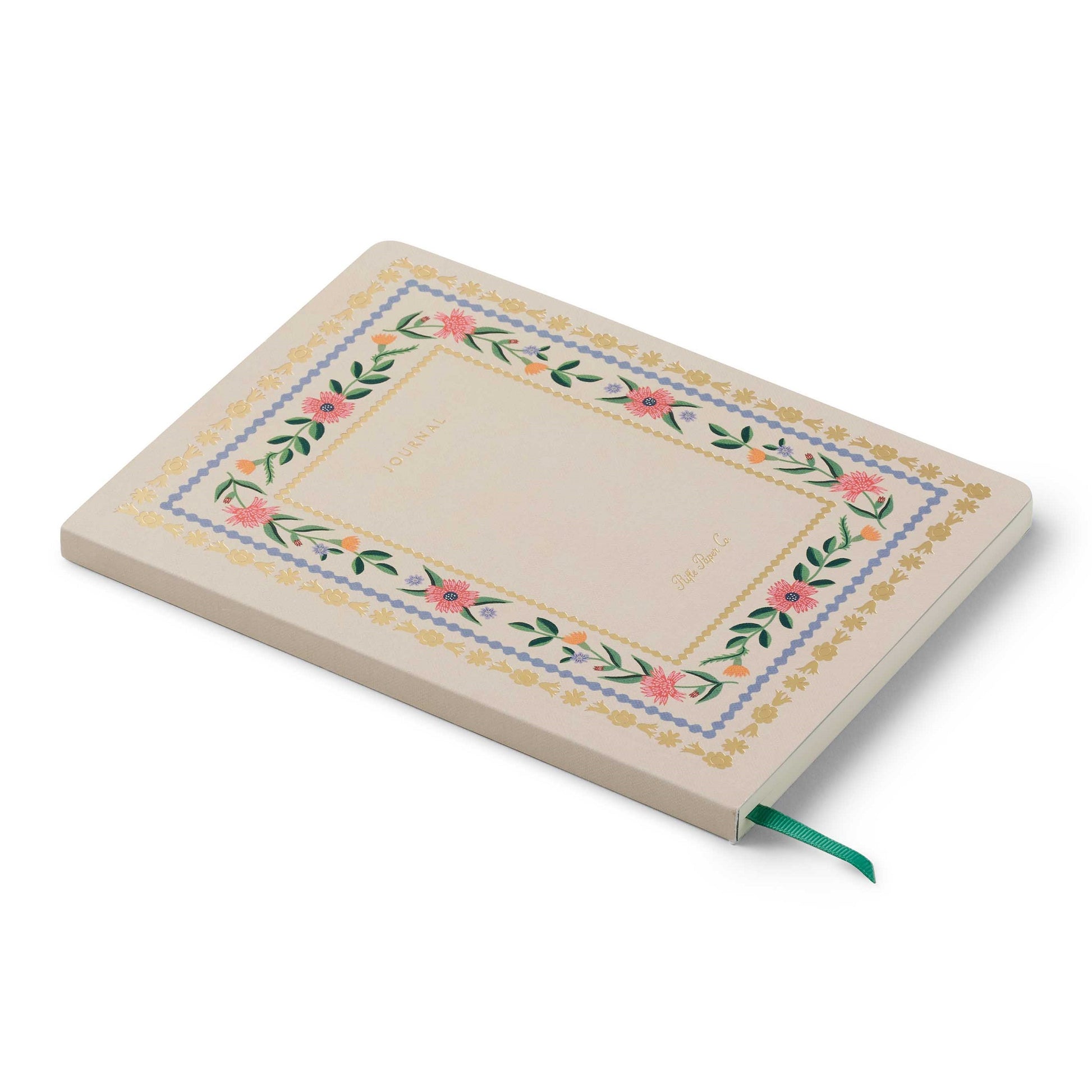 Almost too pretty to write in, this journal is adorned with a delicate, vintage floral border on a neutral cover. Inside, classic lined pages offer the perfect spot for your thoughts, to-do lists, or daily notes. A grosgrain ribbon bookmark and subtle gold foil accents give it a refined finish—perfect for everything from workday plans to quiet personal reflections.