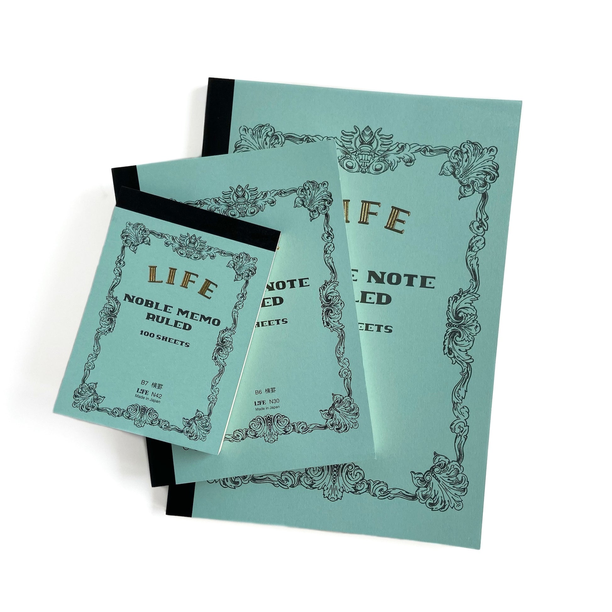 B6 / 5" x 7" / 100 ruled pages / Heavy, cream paper / Fountain pen-friendly paper / Card stock cover / Gold foil details / Masterful "ito-toji" stitched binding / Waxed book cloth spine / Made in Japan