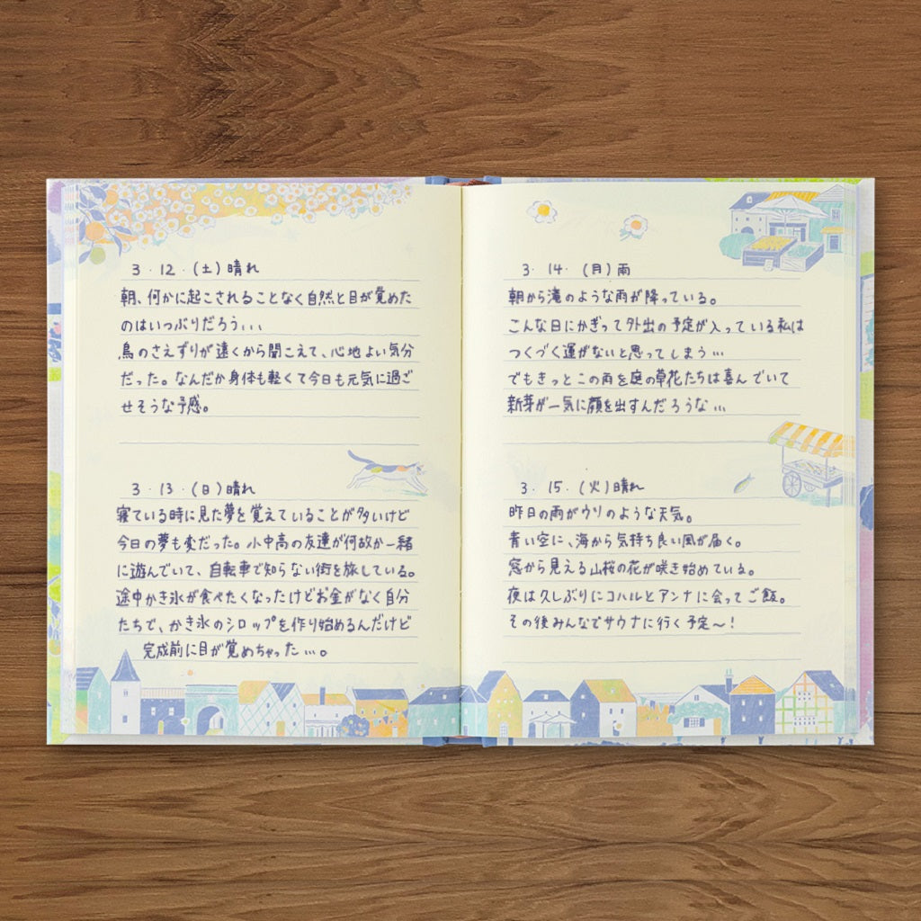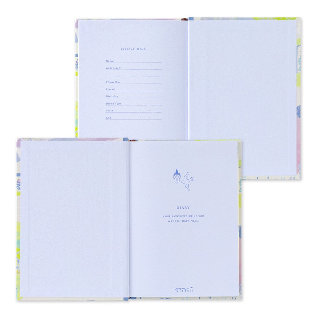 Hardcover diary / 7.1" x 5.1" / 96 ruled pages / 4 unique illustrated page designs / Full colour printing / Illustrated cover page / Thread-sewn binding / Brown ribbon bookmark / Packed with a plastic cover / Made in Japan