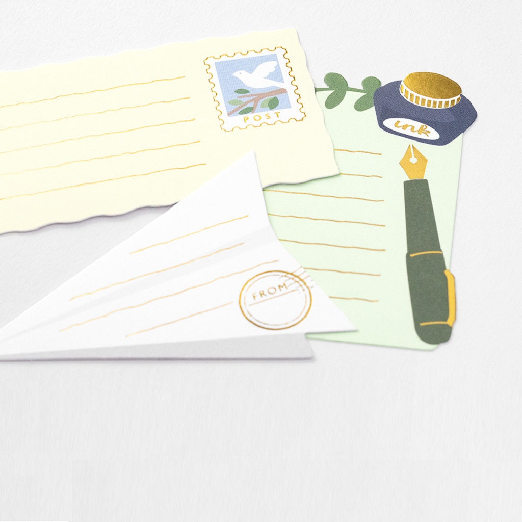 Assorted label stickers / Pack of 15 / 3 designs, 5 of each type / Letter: 2.4" x 1.8" / Postcard: 2.7" x 1.7" / Paper plane: 2.5" x 1.8" / Full colour printing / Die-cut edges / Gold foil details / Fully adhesive / Made in China