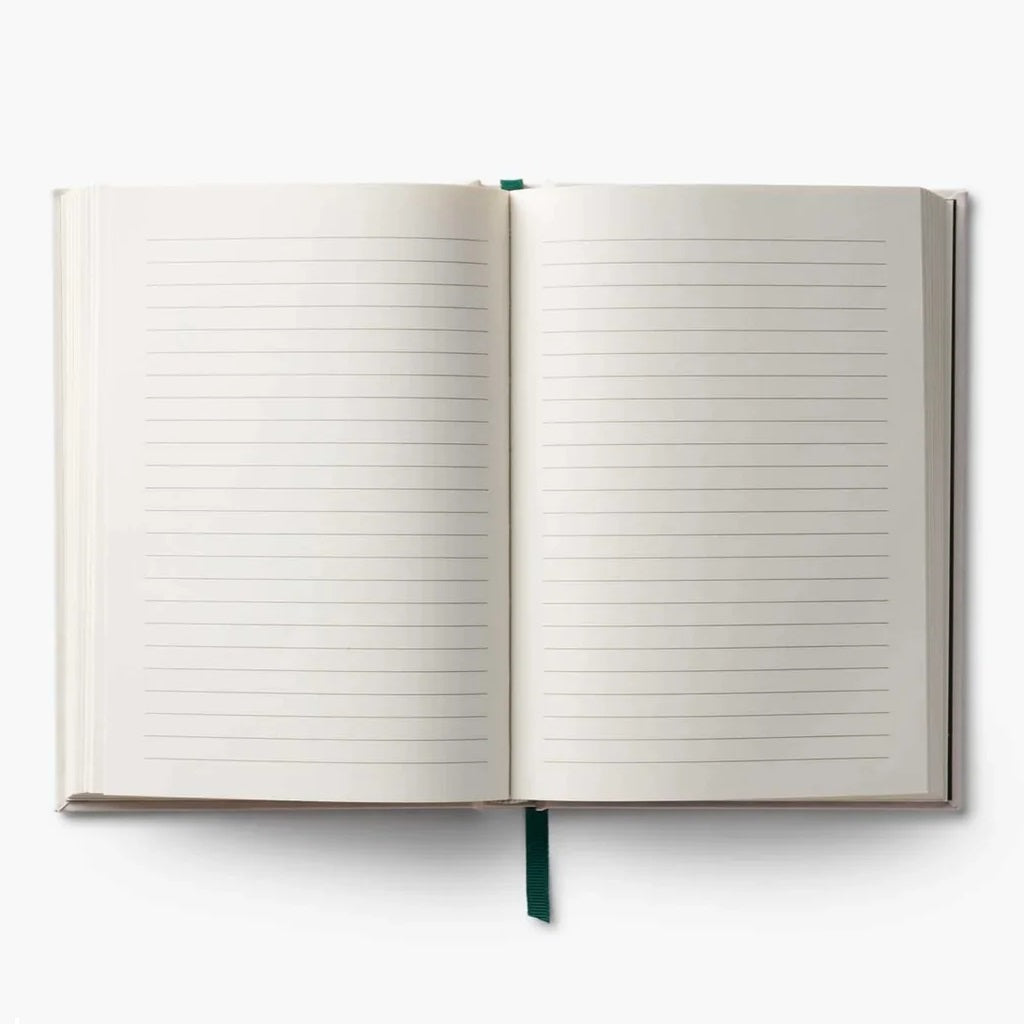 7.9" x 5.75" x 0.8" / 120 ruled pages / 100gsm ivory uncoated wood-free paper / Striped end pages / Beige book cloth cover / Printing and embroidery on front cover / Dark green grosgrain ribbon bookmark / Lay-flat binding / Hardcover / Designed in USA, made in China