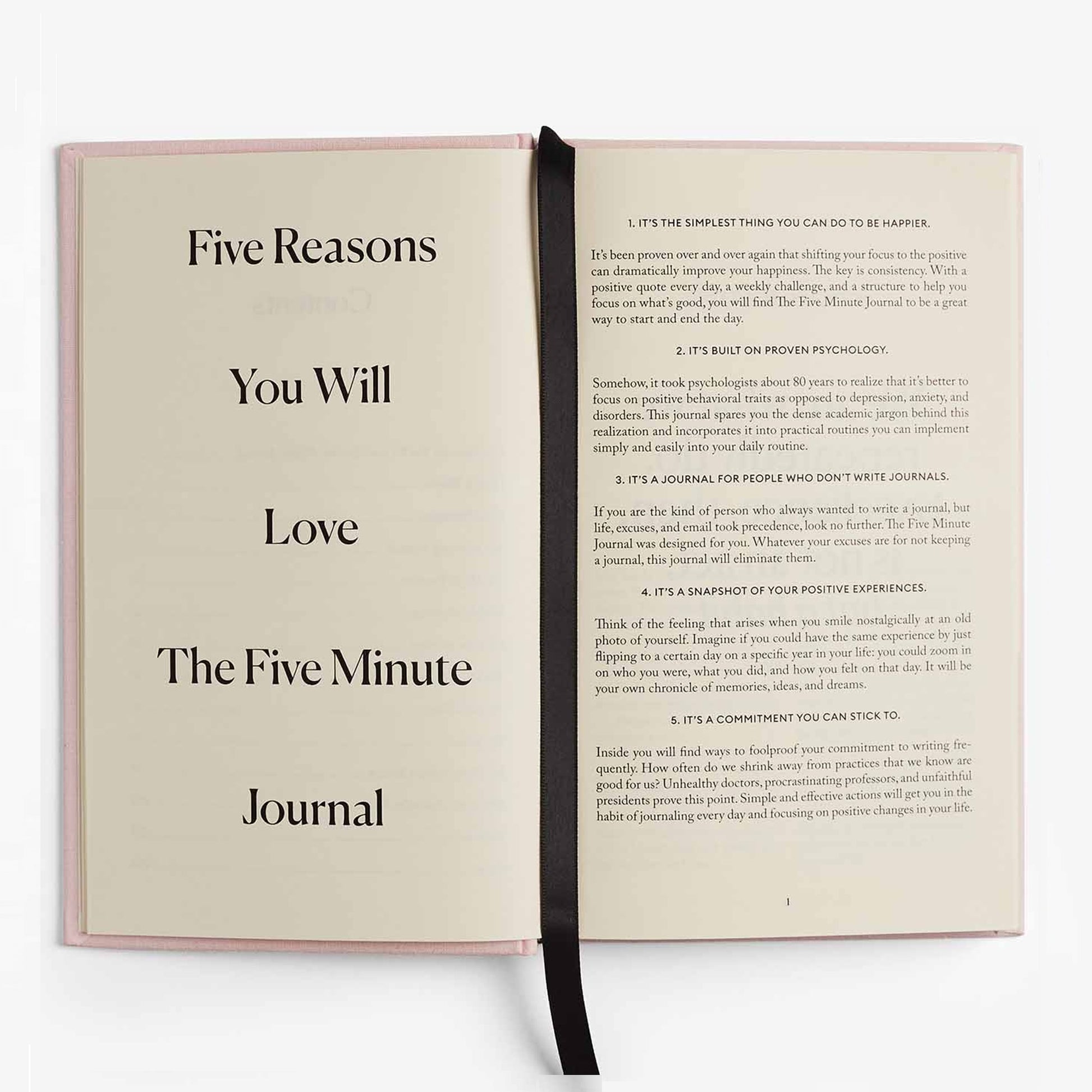 Guided daily journal / 8.5" X 5.2" / 136 pages / 106 journaling pages / Open-dated / Lasts 6 months / 22 instruction pages / 5 ruled notes pages / Inspirational quotes / Light pink book cloth hardcover cover / White printing details / FSC-certified, recycled paper / White ribbon page marker / Designed in United Kingdom, made in China