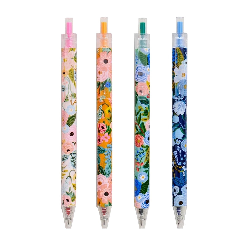 Set of 4 gel pens / 0.5mm rollerball tip / Assorted gel ink colours: pink, orange, green & blue / Plastic body / Printed in colour / 5.5" long / Packaged in a paper box / Box size: 2.75" x 7.25" x 0.625" / Designed in USA, made in China
