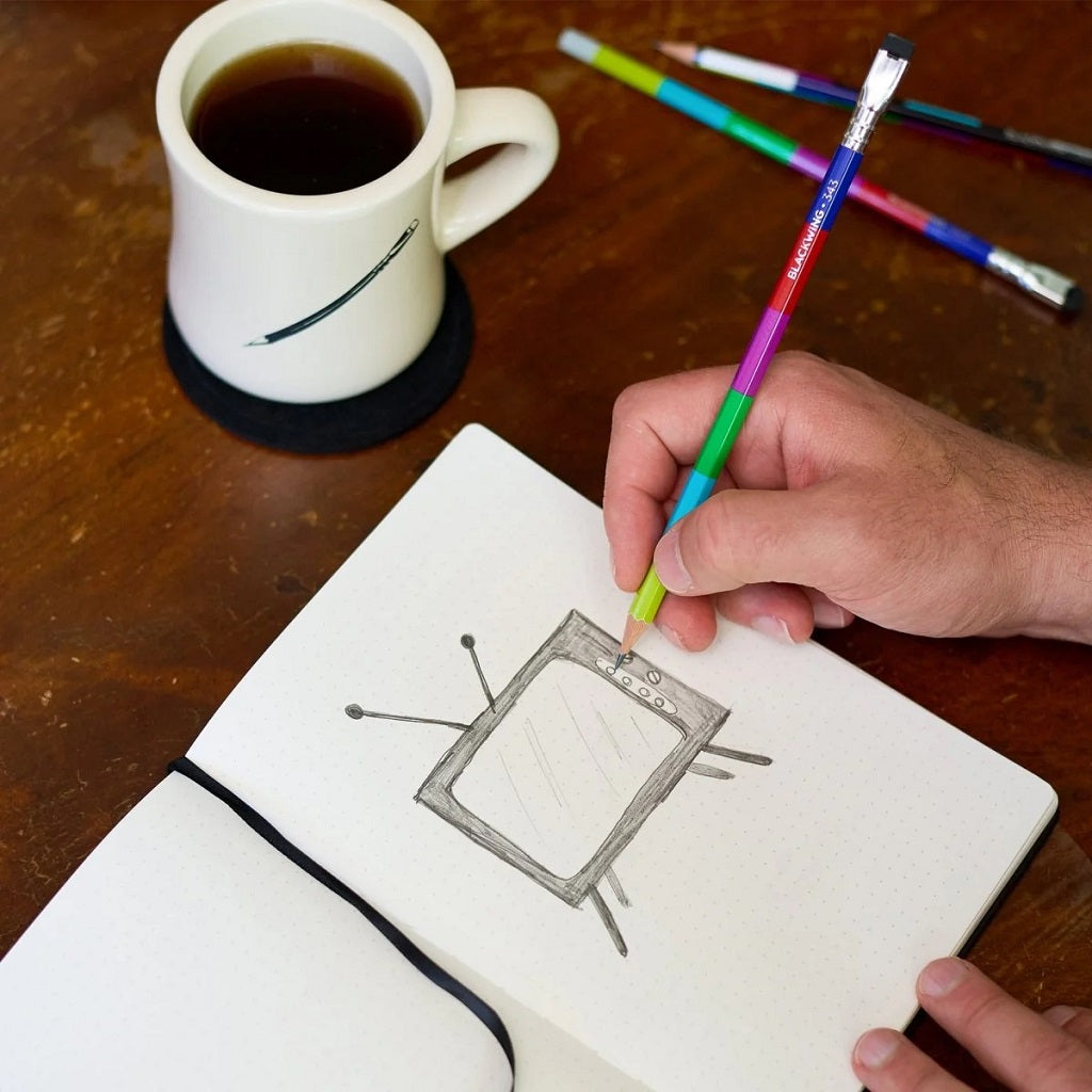 The Blackwing 343 is a nostalgic tribute to the golden era of broadcast television—when entire households tuned in and shared moments together. Each pencil features a striking colour bar finish inspired by the classic NTSC test pattern, paired with Blackwing’s extra-firm graphite for precise, consistent writing. It is a nod to the 343 scan lines of early CRT televisions, stamped in a “TV snow” silver holographic foil that adds a subtle retro touch. It’s a thoughtful design that celebrates not just television, but the shared cultural moments it created across living rooms everywhere. Whether you’re writing, sketching, or collecting, this pencil brings a little piece of that timeless connection to your desk.